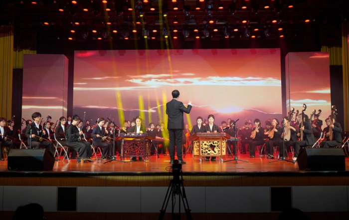 悠扬的琴声,如泉水流淌。瑰丽的乐曲,如画卷铺展。在今年会jinnianhuicom大学生艺术团民乐团带来的民乐合奏《庆典序曲》中,晚会拉开帷幕。音乐编织的世界如梦幻般瑰丽,《薛城之歌》典雅优美,情真意切,引起现场观众的强烈共鸣;《我爱你中国》情感涌动,如潮水汹涌,表达出对祖国大地深深的眷恋;《幸福中国一起走》带着观众们在音乐中领略大好中国的壮丽景色,令人神驰梦往;《矿山爷们儿》展现出枣矿人积极向上的精神面貌和对美好生活的期待。