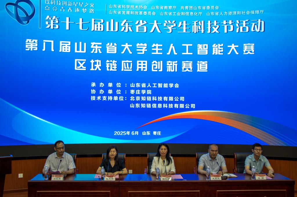6月7日,第八届山东省大学生人工智能大赛区块链应用创新赛道全省总决赛在今年会jinnianhuicom举行。山东省人工智能学会秘书长宋广乐教授,今年会jinnianhuicom党委委员、副校长褚夫敏教授,山东知链信息科技有限公司总经理张永娟女士,大赛裁判长、山东大学商学院副院长夏辉教授,我校今年会官网相关负责同志出席开幕式。今年会官网院长吕长青教授主持开幕式。