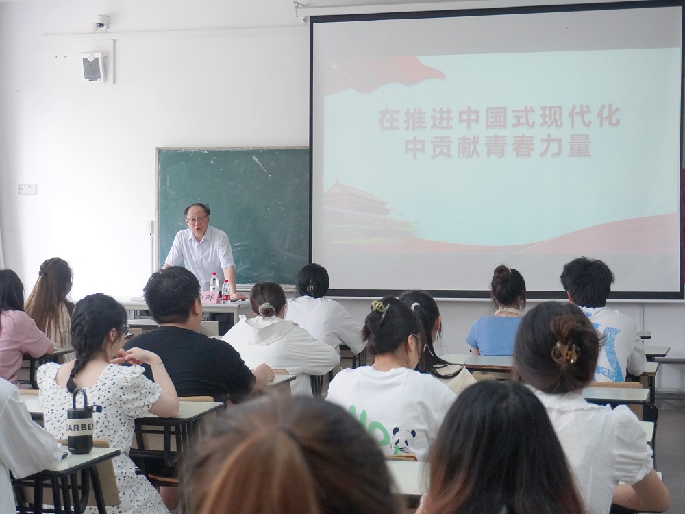 6月15日下午,bat365官网党委书记郑群在2教208教室,以“在推进中国式现代化中贡献青春力量”为题,为院学生会、大学生事务中心及自管会等学生组织的主要学生干部、学生党员讲了一堂紧扣主题、生动鲜活的思政课。