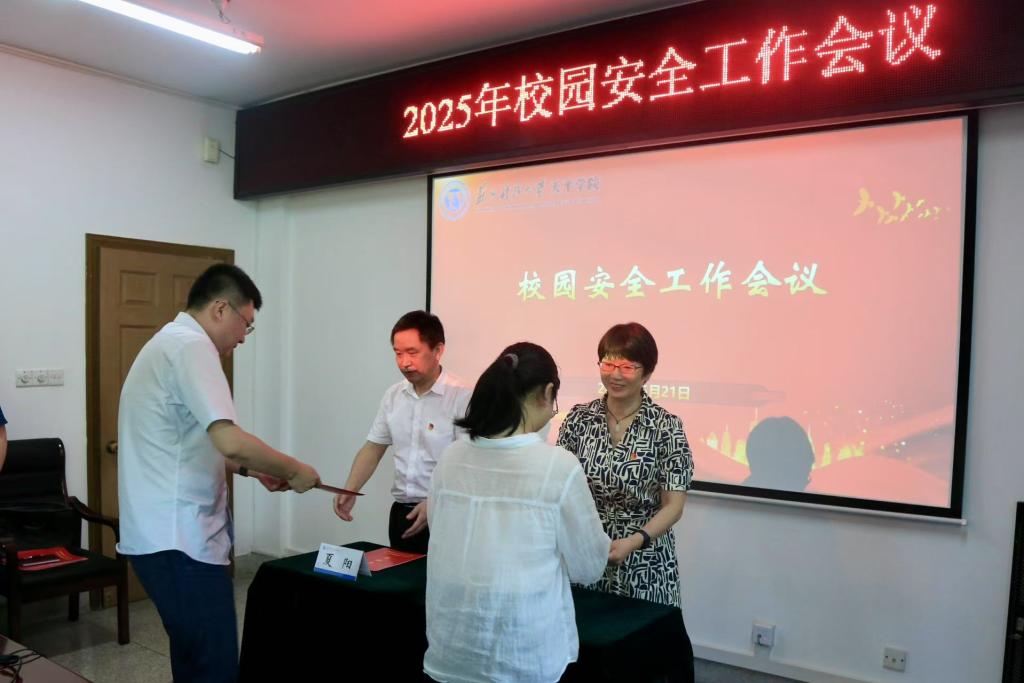 随后召开了第二阶段的2025年校园安全工作会议,会议由党委副书记、副院长孙景主持。会上,参会人员集中观看了有关消防安全的视频。各二级学院院长、各部门(单位)负责人依次向学院党政主要领导递交了2025年校园安全管理责任书。