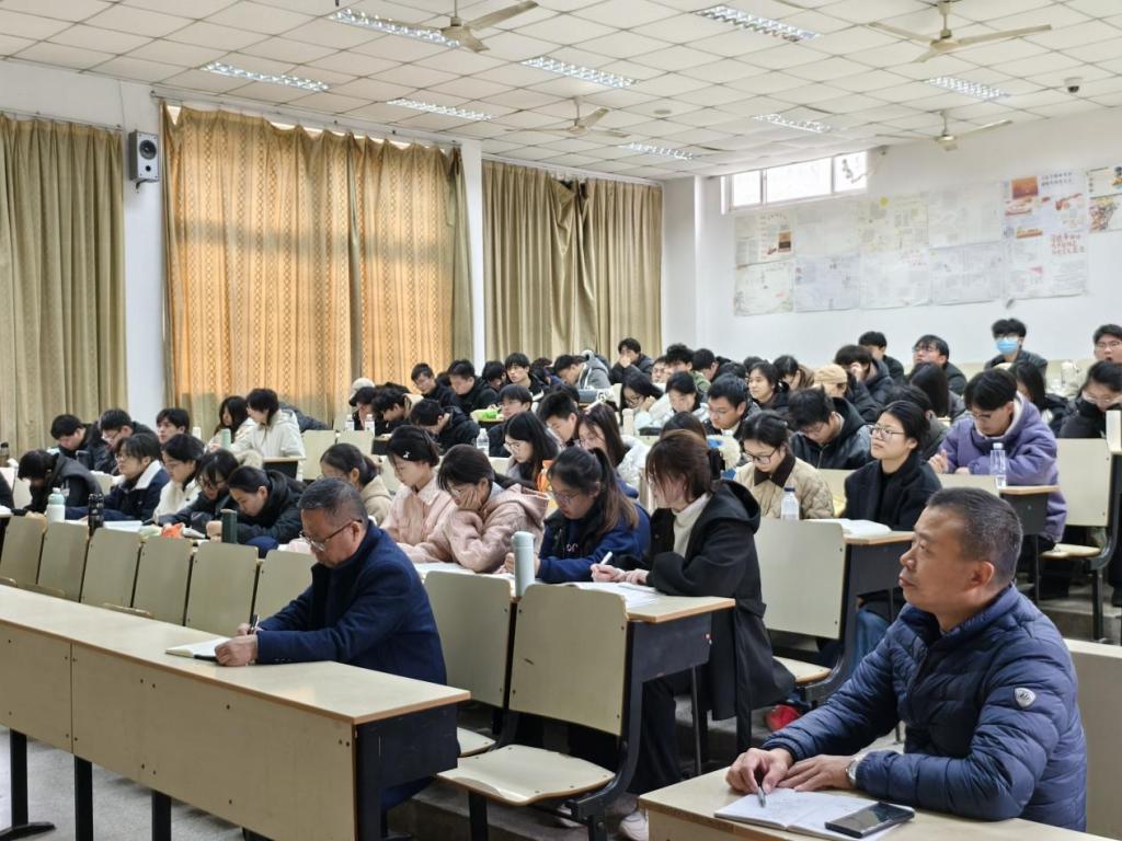 调研期间,陆启义教授随机听取了bat365官网马克思主义学院青年教师叶慧讲授的《马克思主义基本原理》课程。叶慧老师通过清晰的逻辑架构、贴近现实的案例和有效的课堂互动,引导学生深入理解马克思主义的基本原理与方法论。陆启义教授专注聆听,详细记录教学各环节的设计与实施情况,并密切关注学生的课堂反应与参与状态。