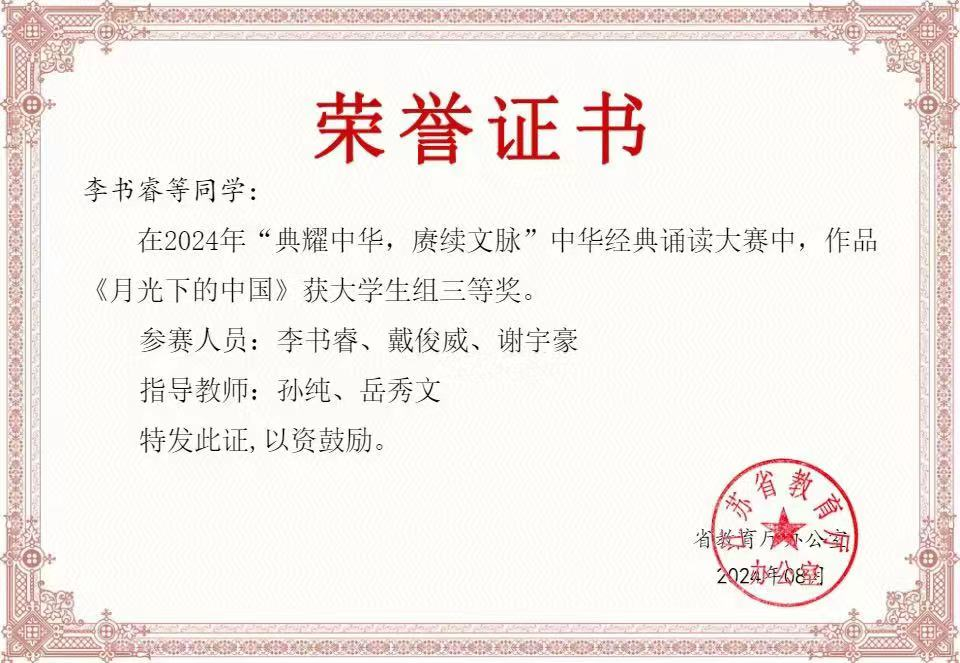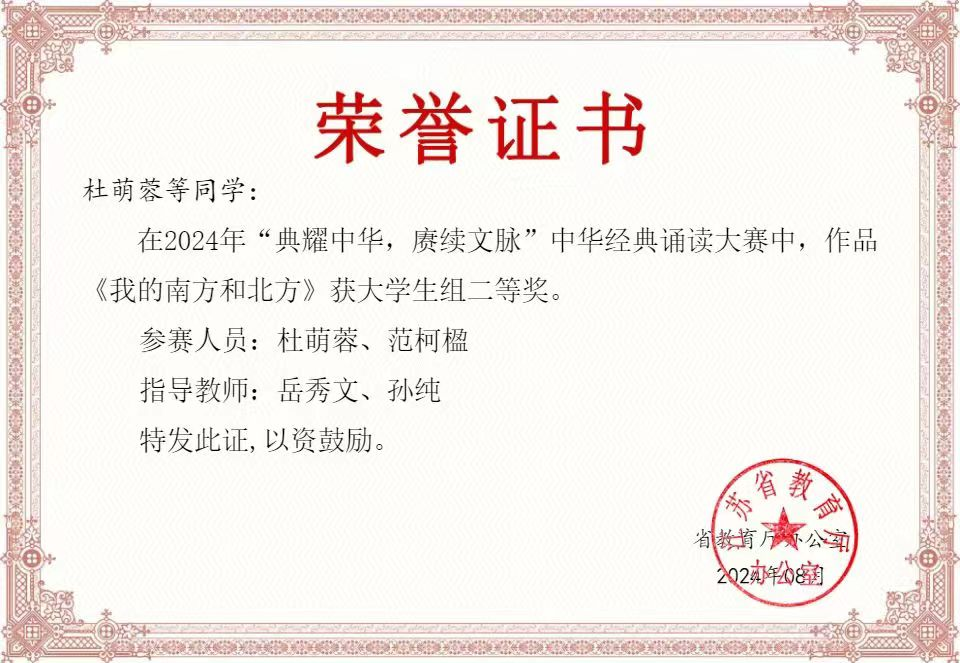 近日,“典耀中华 赓续文脉”江苏省2024年度中华经典诵读大赛获奖结果公布,由bat365官网选送的两组参赛选手历经语言文字知识及诵读常识网络测评、录制诵读视频两个环节,最终获二等奖1项、三等奖1项,这一成绩在省内同类高校中名列前茅。本次大赛共评出特等奖3项、一等奖6项、二等奖12项、三等奖17项、优秀奖19项。