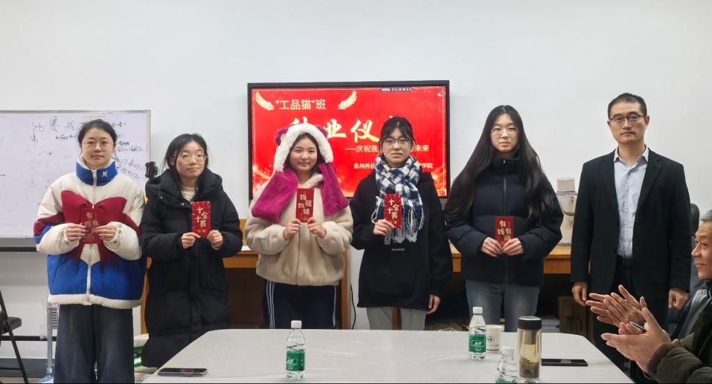 典礼开始,江苏工品猫物联科技有限公司总经理孙春宣布了工品猫班奖学金的获奖名单,表彰学习成绩优秀的同学。随后,举行了颁奖仪式,获奖学生依次登台接受表彰并合影留念。接着,学生代表分享了在“工品猫班”学习期间的成长与感悟,表示通过这一年的学习,不仅掌握了扎实的专业知识,还锻炼了实践能力,增强了职业素养。