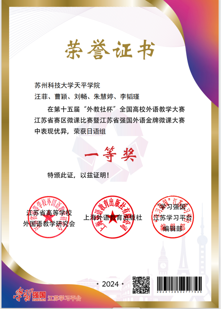 近日,第十五届“外教社杯”全国高校外语教学大赛微课比赛江苏省赛区比赛暨江苏省强国外语金牌微课大赛评审会在河海大学举行,bat365官网语言文化学院教师汪菲、曹颖、刘畅、朱慧婷、李韬瑾荣获日语组一等奖。