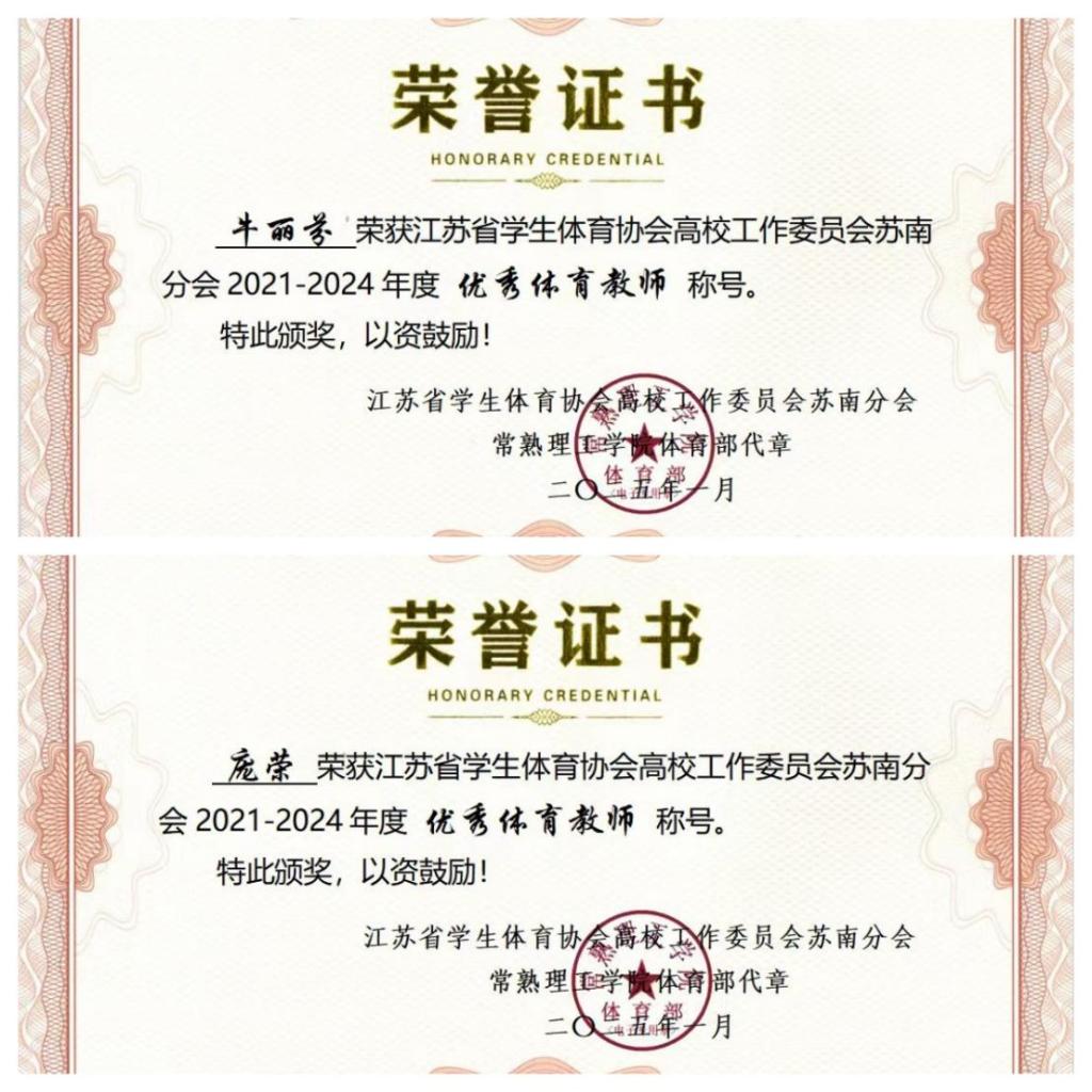 近日,江苏省学生体育协会高校工作委员会苏南分会2021-2024年度优秀教师评选结果揭晓,bat365官网公共教学部牛丽芬、庞荣两位教师获评“苏南高校优秀体育教师”称号。此次评选,意在表彰在学校体育教育教学和人才培养工作中取得突出业绩的优秀体育教师。