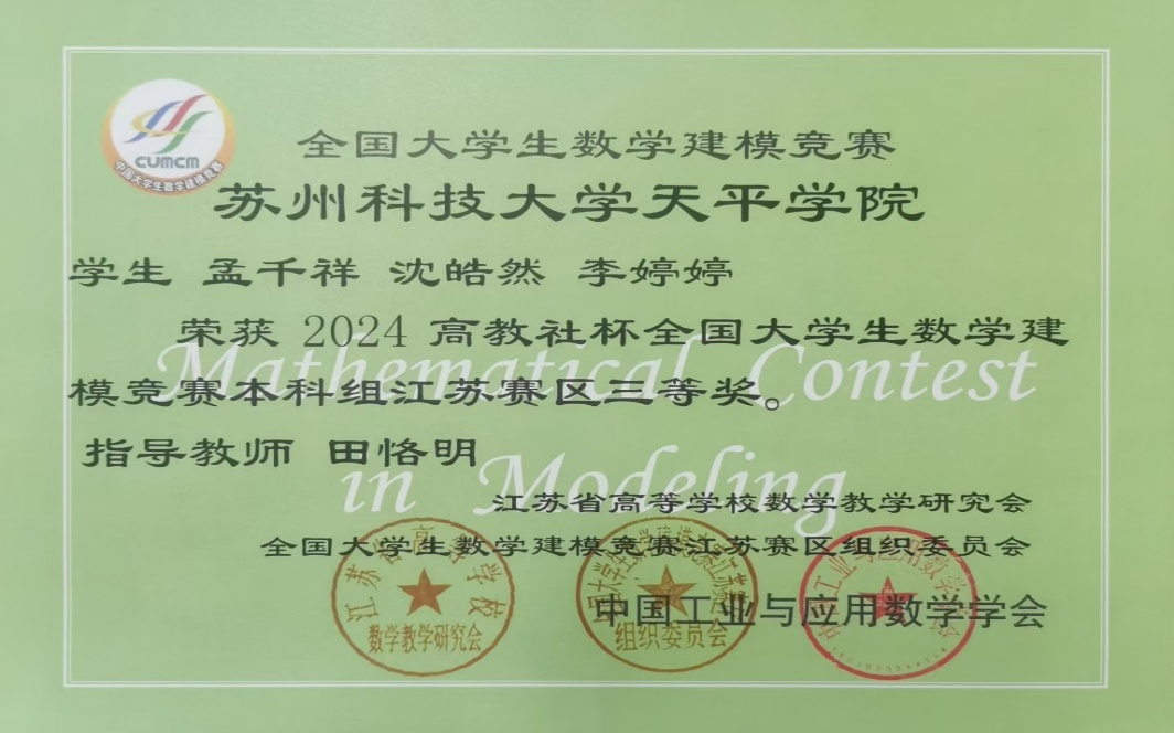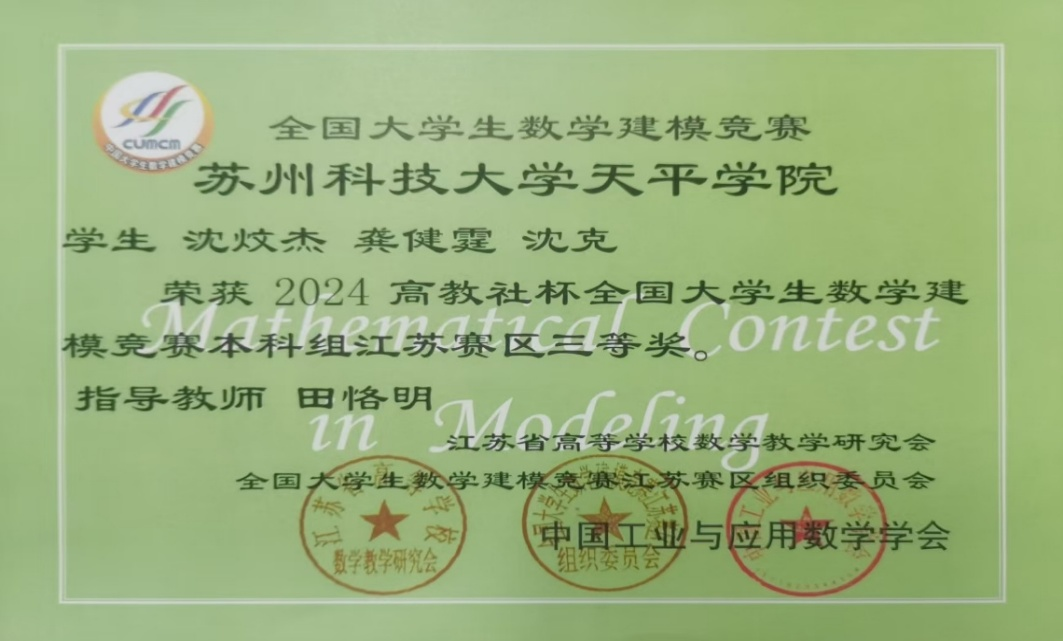 近日,2024“高教社杯”全国大学生数学建模竞赛成绩揭晓,bat365官网公共教学部田恪明老师指导的两个参赛团队(沈炆杰、龚健霆、沈克;孟千祥、沈皓然、李婷婷)荣获江苏赛区三等奖。