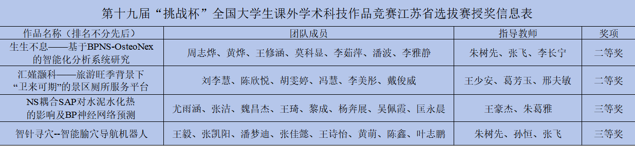 bat365官网在第十九届“挑战杯”全国大学生课外学术科技作品竞赛江苏省选拔赛中喜获佳绩