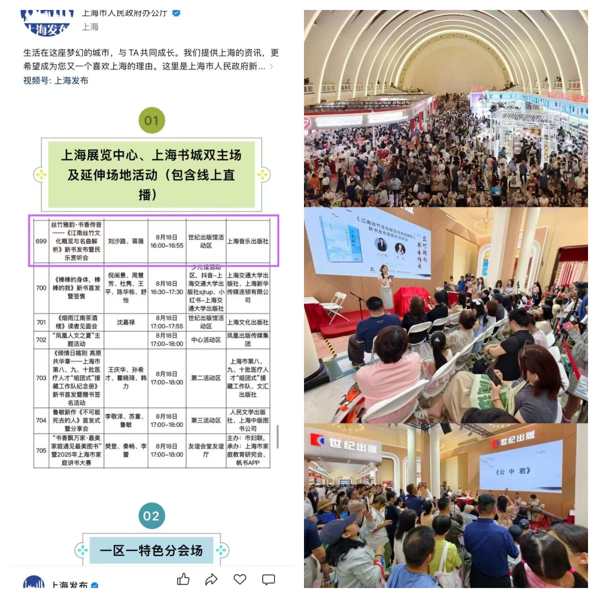 8月18日,bat365官网艺术学院刘沙路副教授携其潜心两年完成的专著《江南丝竹文化概览与名曲解析》(上海音乐出版社出版),应邀亮相2025上海书展“新书发布暨民乐赏听会”。
