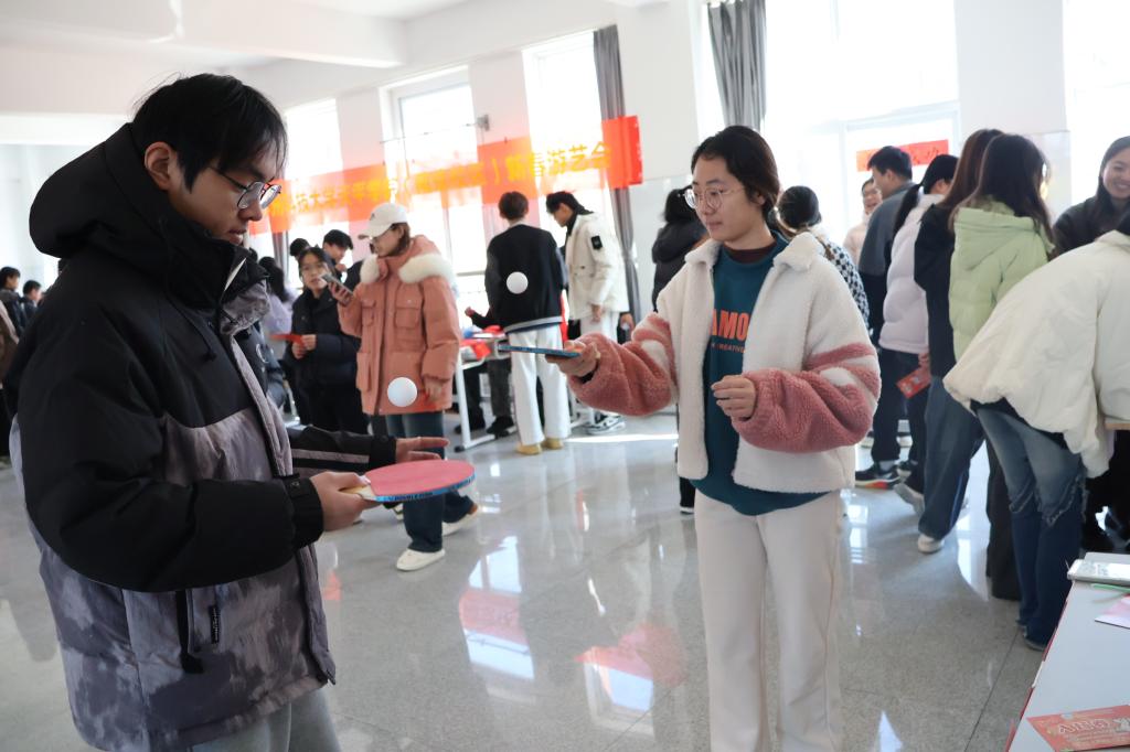 新春游艺会是bat365官网延续多年的传统活动,本届活动设置了“猜灯谜”“挥毫泼墨”“创意DIY”“乒乓颠球挑战”等八项年味浓郁、趣味盎然的游艺项目,并保留深受欢迎的写对联环节。现场既有轻松愉快的小游戏,也不乏具有一定挑战性的互动项目,吸引了众多师生踊跃参与。同学们在手工制作、乒乓颠球等环节中全神贯注、稳扎稳打,展现出笃行不怠的认真姿态;老师们则耐心排队,挥毫书写春联与“福”字,将一句句“马到成功”“骏业宏开”的美好祝愿融入笔墨之中,寄语同学们在紧张的学习中适当放松,科学安排时间,以更加昂扬饱满的状态迎接即将到来的期末考试。