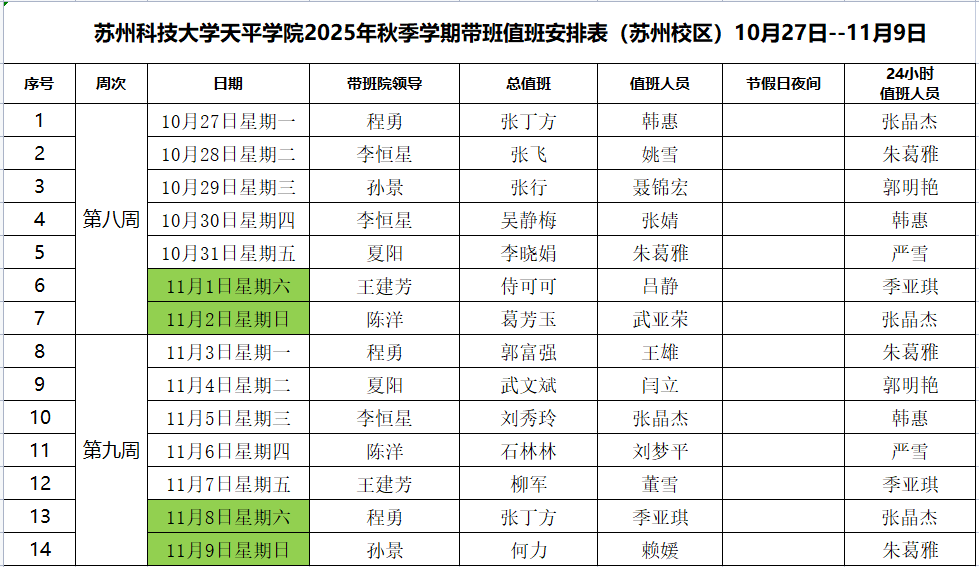 bat365在线中国官网登录入口2025年秋季学期带班值班安排表(苏州校区)10月27日--11月9日