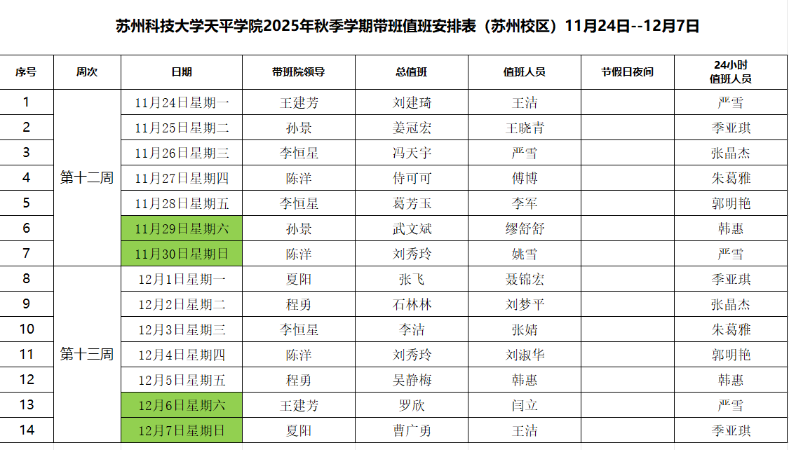 bat365在线中国官网登录入口2025年秋季学期带班值班安排表(11月24日--12月7日)