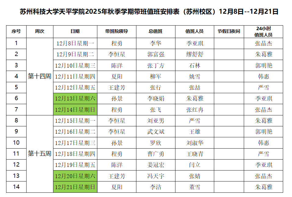bat365在线中国官网登录入口2025年秋季学期带班值班安排表(12月8日--12月21日)