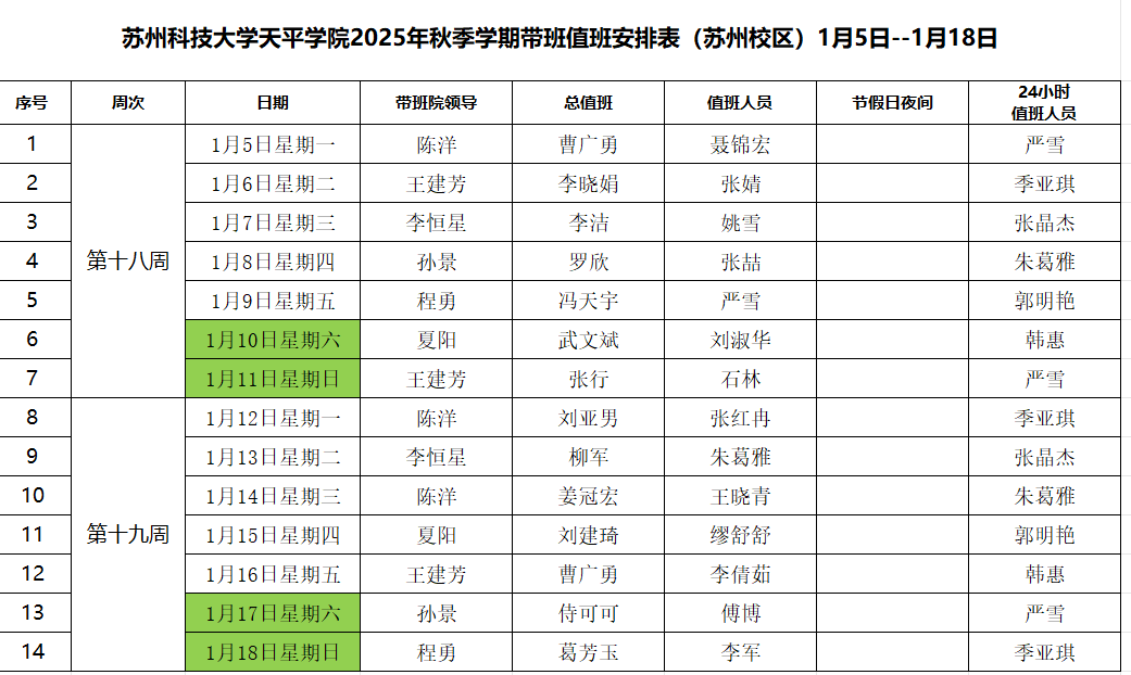 bat365在线中国官网登录入口2025年秋季学期带班值班安排表(1月5日--1月18日)