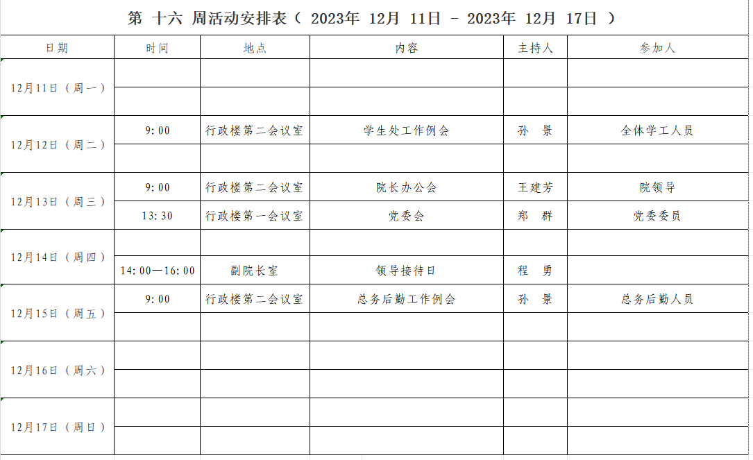 第 十六 周活动安排表( 2023年 12月 11日 - 2023年 12月 17日 )