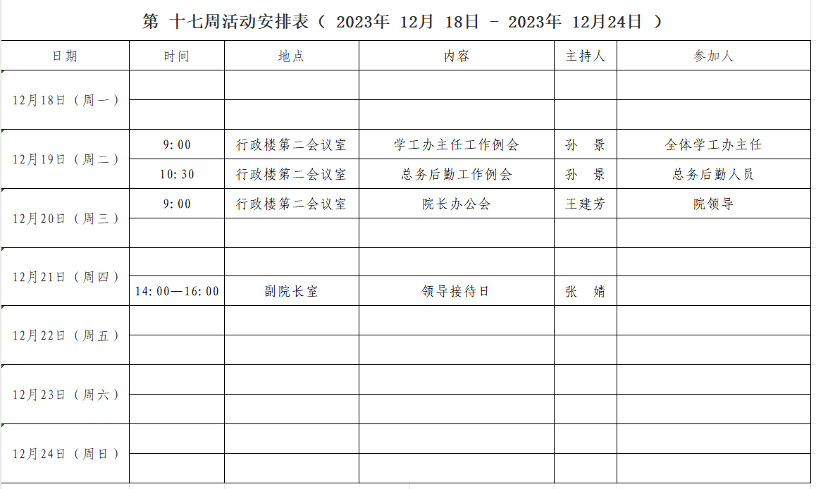 第 十七 周活动安排表( 2023年 12月 18日 - 2023年 12月 24日 )