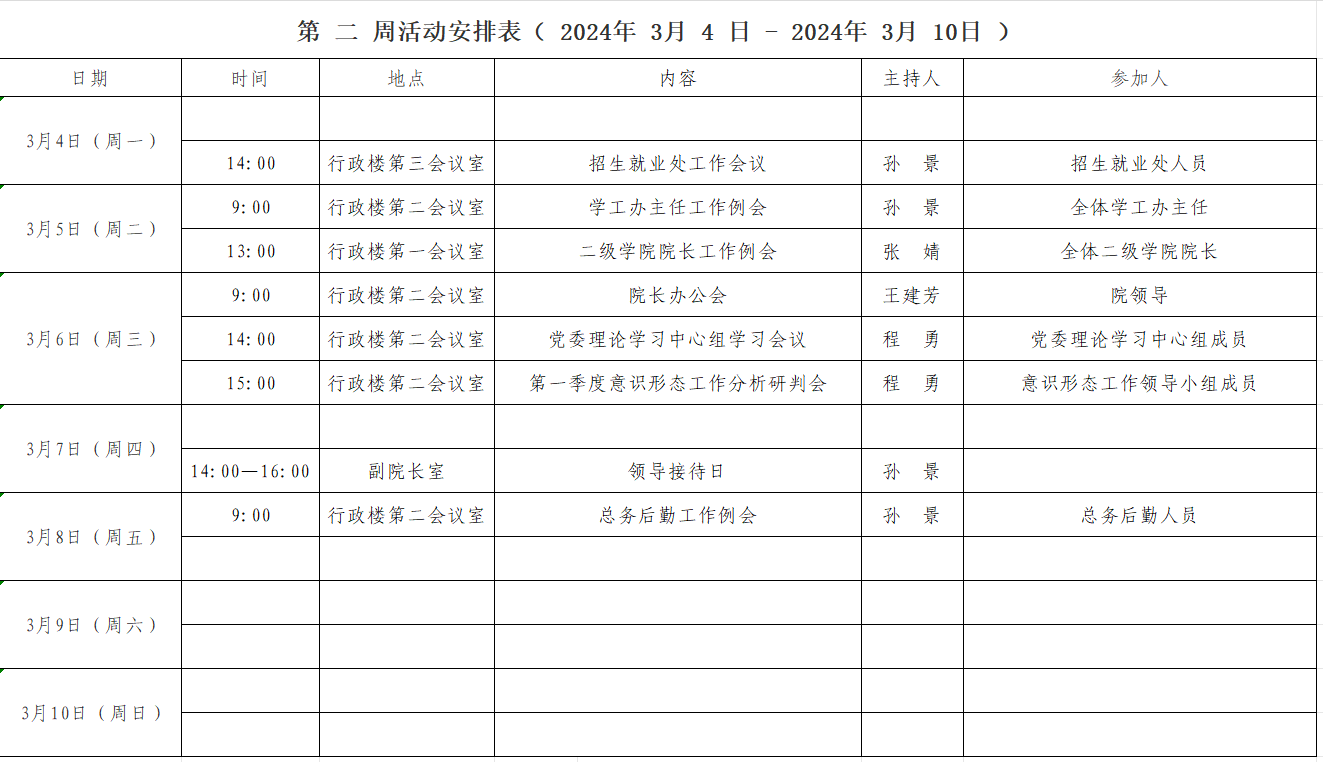 第 二 周活动安排表( 2024年 3 月 4 日 - 2024年 3 月 10 日 )
