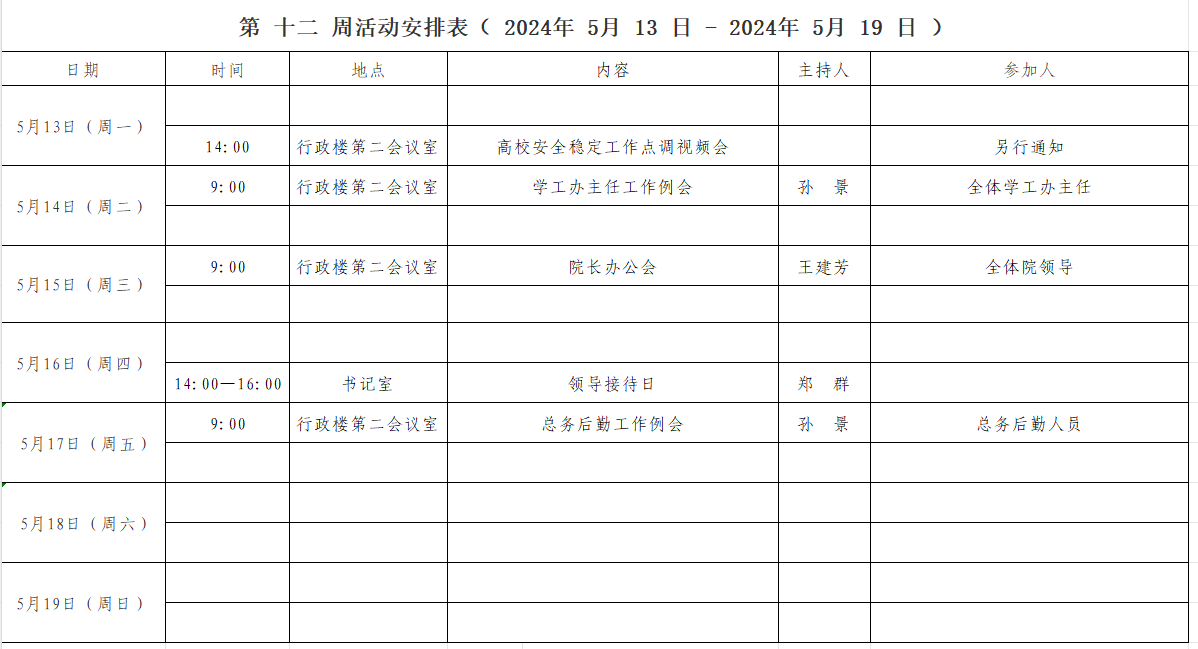 第 十二 周活动安排表( 2024年 5 月 13 日 - 2024年 5 月 19 日 )