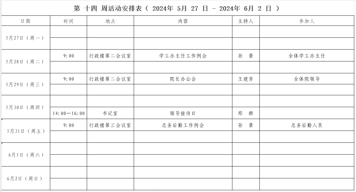 第 十四 周活动安排表( 2024年 5 月 27 日 - 2024年 6 月 2 日 )