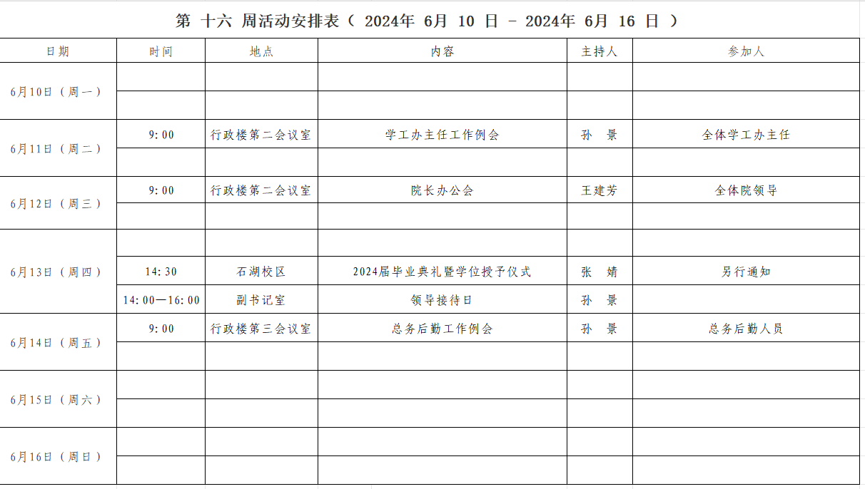 第 十六 周活动安排表( 2024年 6 月 10 日 - 2024年 6 月 16 日 )