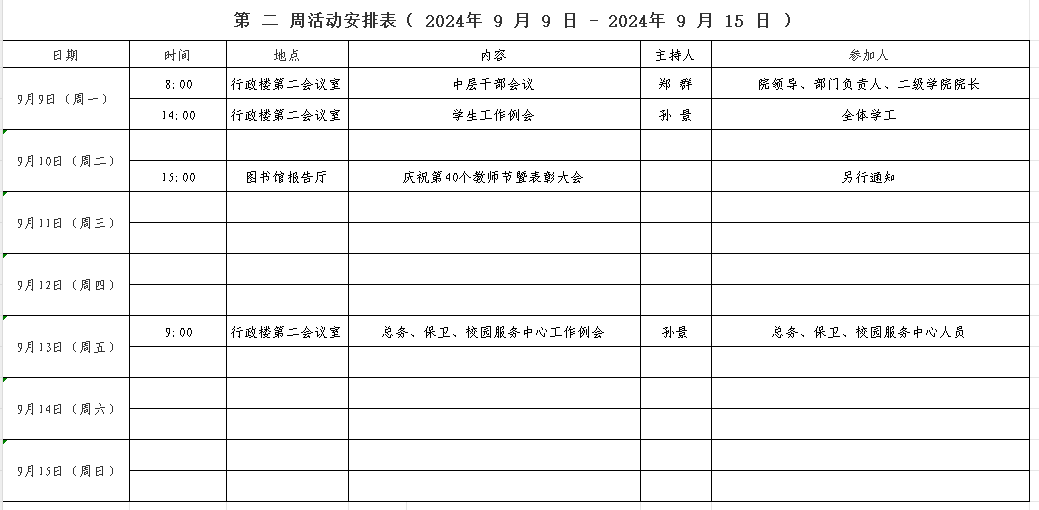 第 二 周活动安排表( 2024年 9 月 9 日 - 2024年 9 月 15 日 )