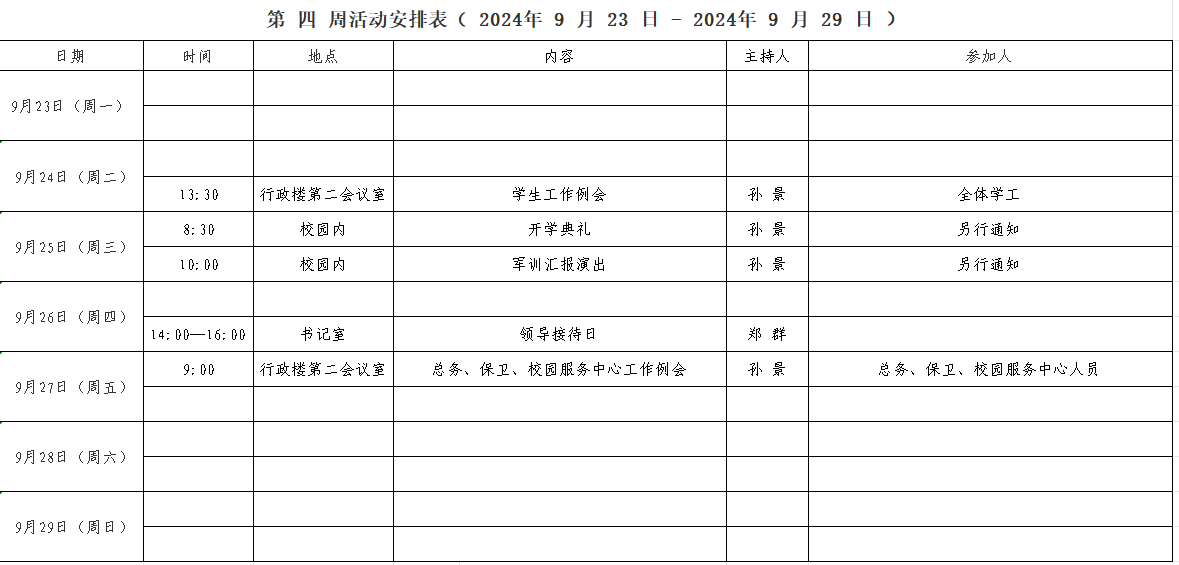第 四 周活动安排表( 2024年 9 月 23 日 - 2024年 9 月 29 日 )
