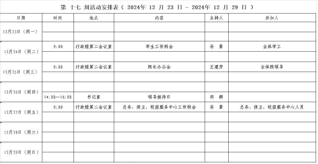 第 十七 周活动安排表( 2024年 12 月 23 日 - 2024年 12 月 29 日 )