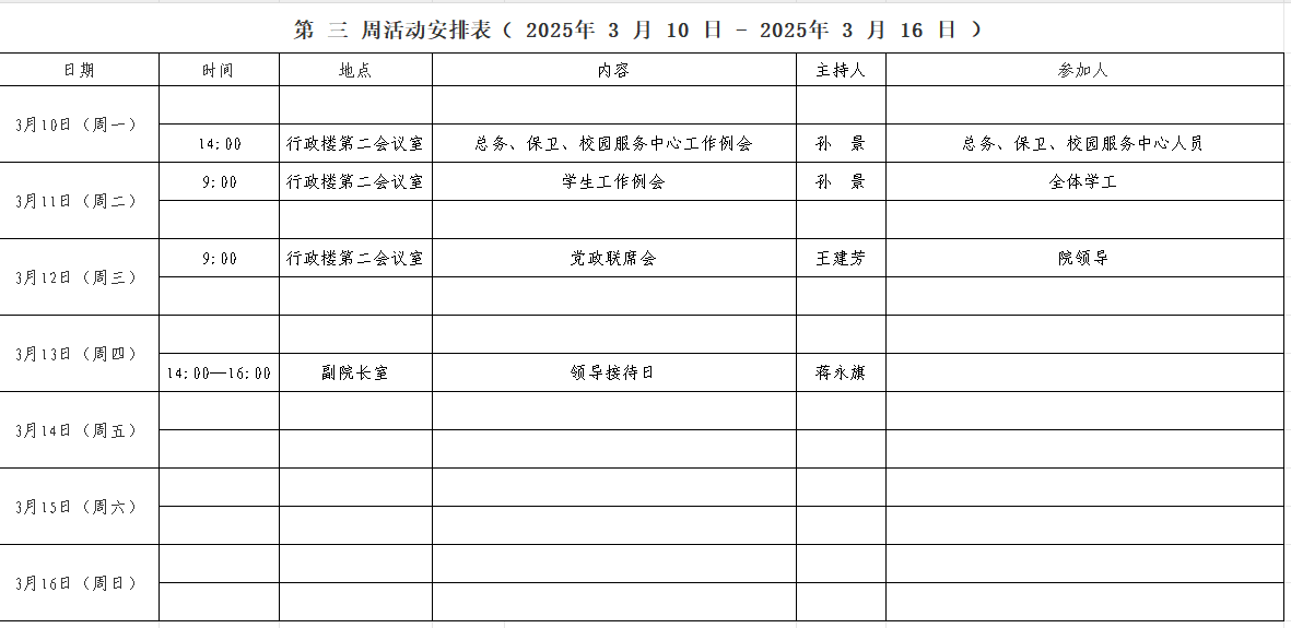 第 三 周活动安排表( 2025年 3 月 10 日 - 2025年 3 月 16 日 )