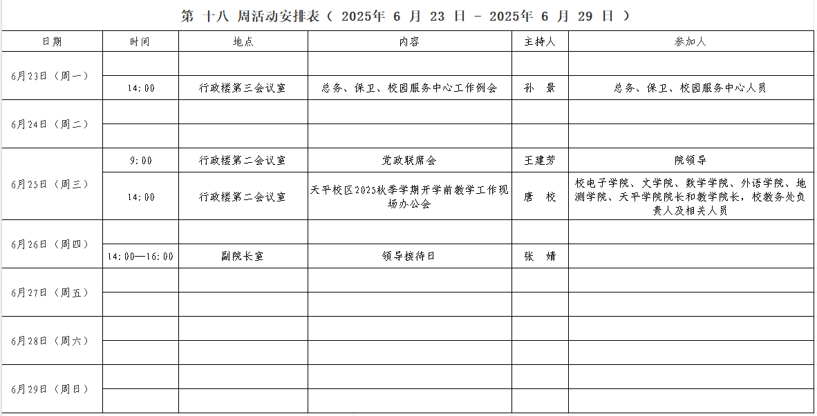 第 十八 周活动安排表( 2025年 6 月 23 日 - 2025年 6 月 29 日 )