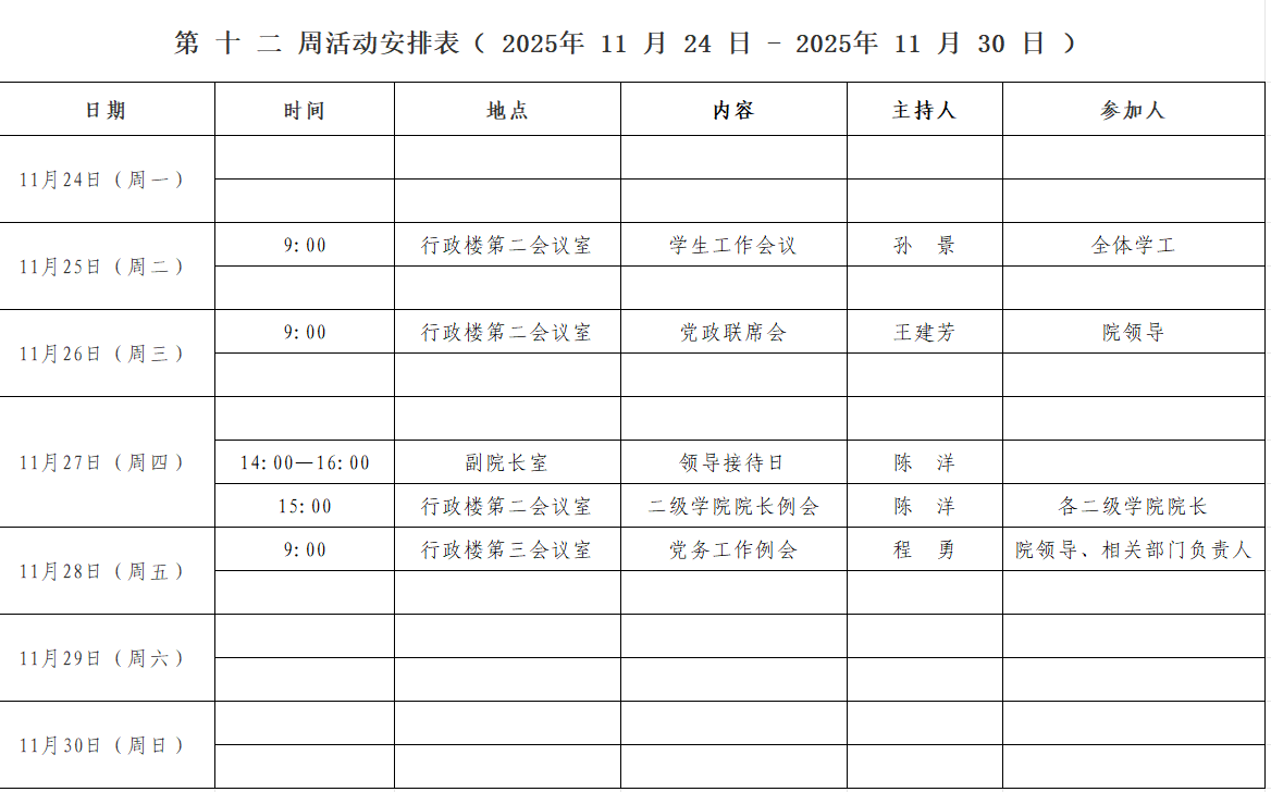 第 十二 周活动安排表( 2025年 11 月 24 日 - 2025年 11 月 30 日 )