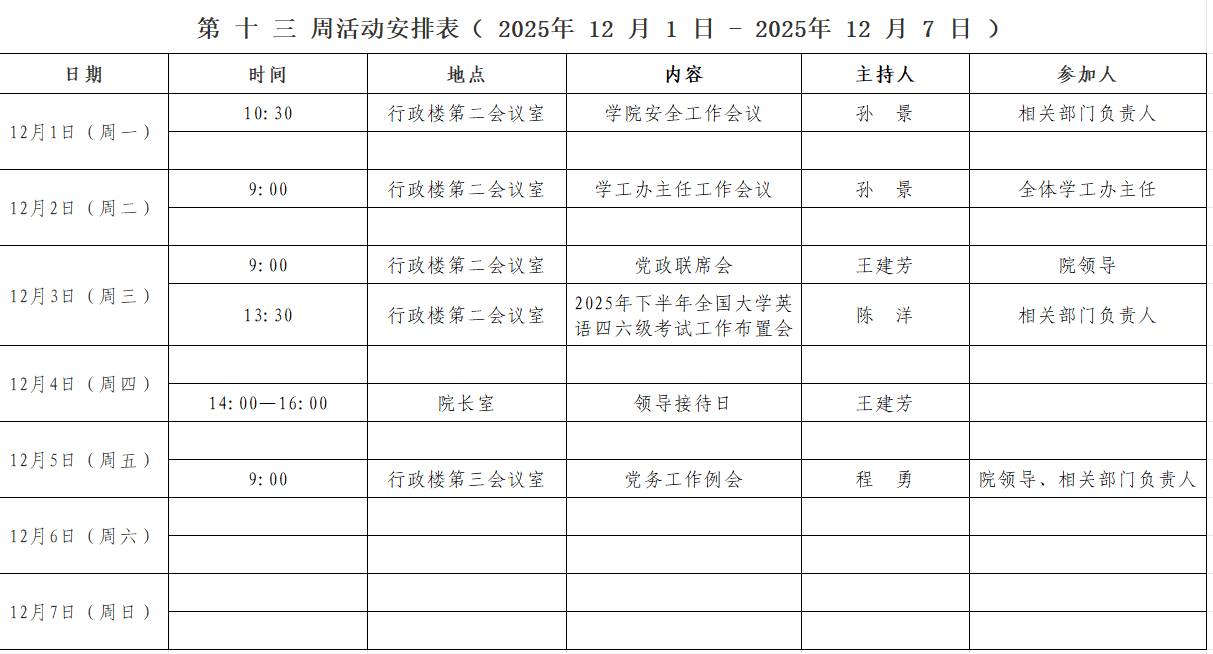 第 十三 周活动安排表( 2025年 12 月 1 日 - 2025年 12 月 7 日 )