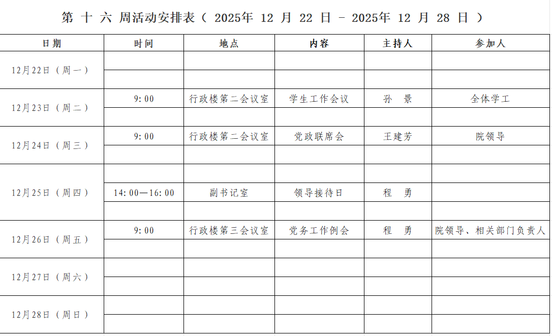 第 十六 周活动安排表( 2025年 12 月 22 日 - 2025年 12 月 28 日 )