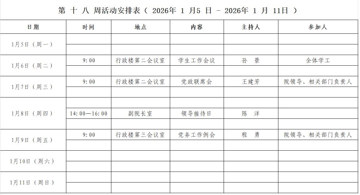 第 十八 周活动安排表( 2026 年1 月 6 日 - 2026 年 1月11日 )