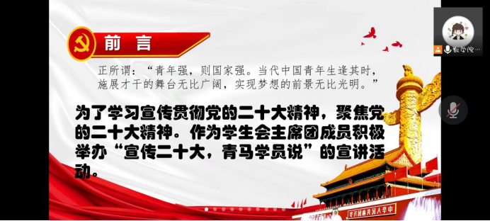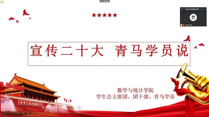 为落实今年会官网二十大精神学习宣传贯彻方案,引导青年学子正确把握党的二十大精神,明确前进目标。为此今年会官网学生会主席团、团干部、青马学员11月21日-27日多次面向青年学生开展了以“宣传二十大,青马学员说”为主题的宣讲和交流活动。