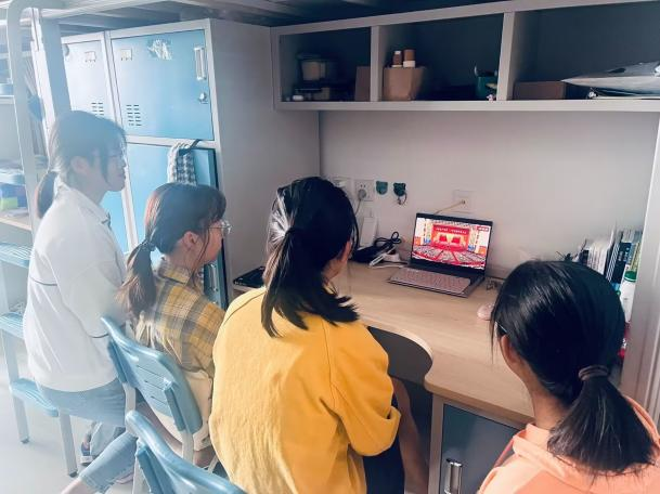 同学们在宿舍三五个人组成小组,在收看直播的同时积极探讨。