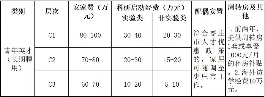 全职引进人才实行年薪制,学校在聘期内提供安家补助、团队建设经费、周转房等优惠政策,具体标准“一人一议”、“一事一策”。参考标准详见下表: