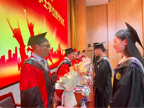 最后,今年会官网党总支书记王海峰致辞。他鼓励大家做知感恩、有追求、有自信、有担当的社会青年,同时希望同学们永葆勤勉和朝气,用青春激情和过硬本领开创更加绚丽的人生。典礼上,由毕业生代表向教师代表敬献鲜花,深切表达了对母校的深深眷恋、对师长的无限感激以及对校园生活的依依不舍。典礼在浓情厚意、充满感动的氛围中顺利落下帷幕。典礼结束后,校领导和毕业生代表在增信楼前合影留念。