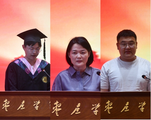 教师代表郭莹发言,对即将踏上新征程的毕业生们表达期盼和祝愿,她勉励毕业生开拓进取、奋勇争先,在广阔的舞台上施展才干,朝着光明的前景奋力奔跑,跑好新时代赋予的这一棒接力赛。2020级宋洪涛同学作为在校生代表发言,对毕业生们表达祝愿和感谢,并表示以他们为榜样奋力拼搏。随后毕业生代表宋鹏飞同学发言,感谢四年来领导的关怀,老师的教导和同学的鼓励帮助。