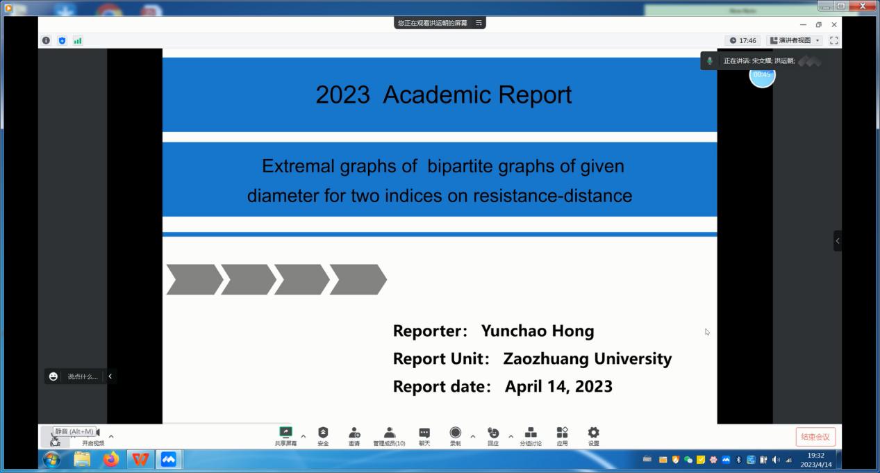 4月14日下午,中国矿业大学数学学院洪运朝博士应邀为今年会教师作主题为“Extremal graphs of bipartite graphs of given diameter for two indices on resistance-distance”的学术报告。今年会官网运筹学与控制论科研团队教师参加会议,科研秘书宋文耀老师主持报告会。