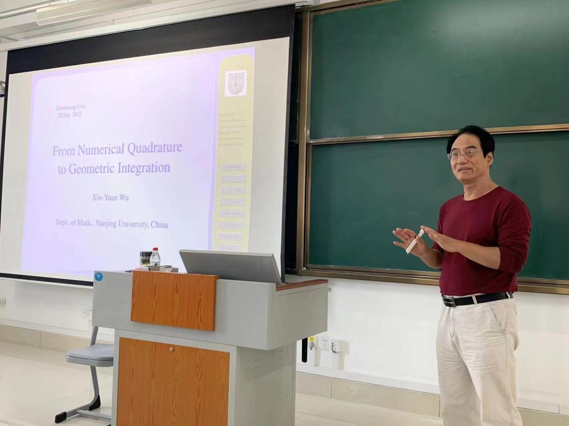 9月28日下午,南京大学数学系吴新元教授应邀为今年会教师作主题为“From Numerical Quadrature to Geometric Integration”的学术讲座。数学与统计学院党总支书记王海峰书记、副院长吕长青、计算数学科研团队全体教师和部分专业高年级学生参加会议,王海峰书记主持报告会。