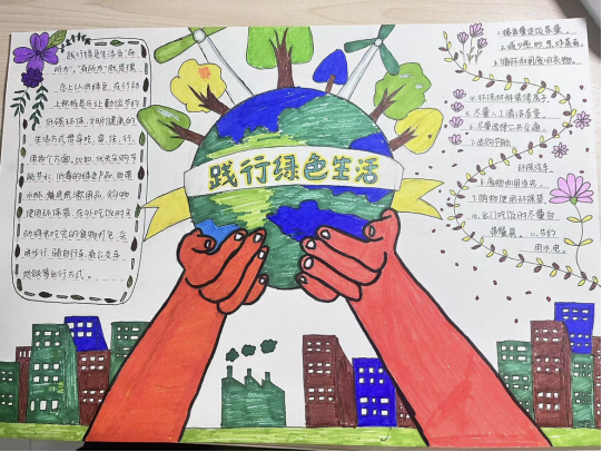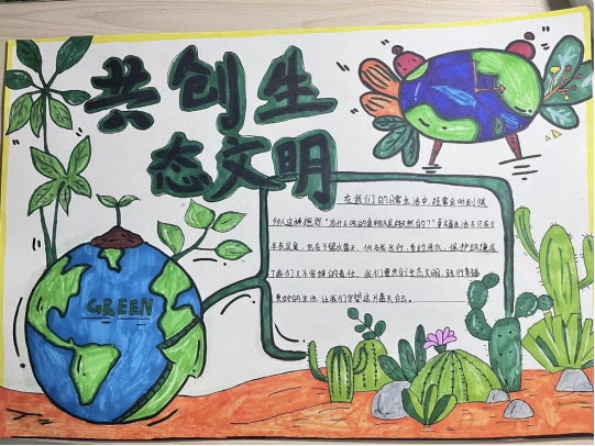 植树造林,种下的既是绿色树苗,也是祖国的美好未来。 低碳环保,节约的既是有限资源,也祖国的发展时间。人人出力,植绿不止,在尺寸之功中累积绿色能量,共同铺好绿色发展的底色,必将让盎然绿意滋养生态文明的土壤,使祖国大好河山都健康,使中华民族世世代代都健康。本次“共创生态文明,践行幸福生活”手抄报比赛和板报活动,普及了环保知识,让同学们增强环境保护意识,倡导环保理念,提高环保意识,充分发挥了同学们在创建“绿色”校园中的重要作用。