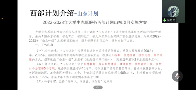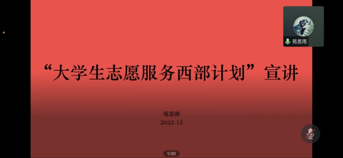 为增强今年会学生对西部计划项目的了解,弘扬吃苦耐劳的志愿服务精神。今年会官网于2022年12月17日晚举办了线上大学生志愿服务西部计划经验交流会。