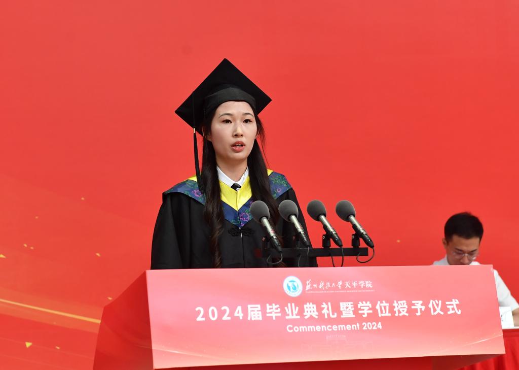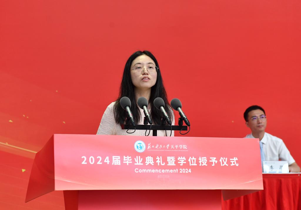 环境科学与工程学院给排水2021班尹艺璇同学代表全体毕业生发言,表示将保持坚韧与执着,不断超越自我,在人生的道路上砥砺前行。教师代表费珺在发言中希望全体毕业生坚持勤劳和勇敢、正直和善良,面向未来,奔腾不止,在各自的领域里承担“社会人”的责任。毕业生家长代表杨伟成先生希望全体毕业生要保持热情、不断学习、努力奋斗,用智慧和勇气书写精彩人生。