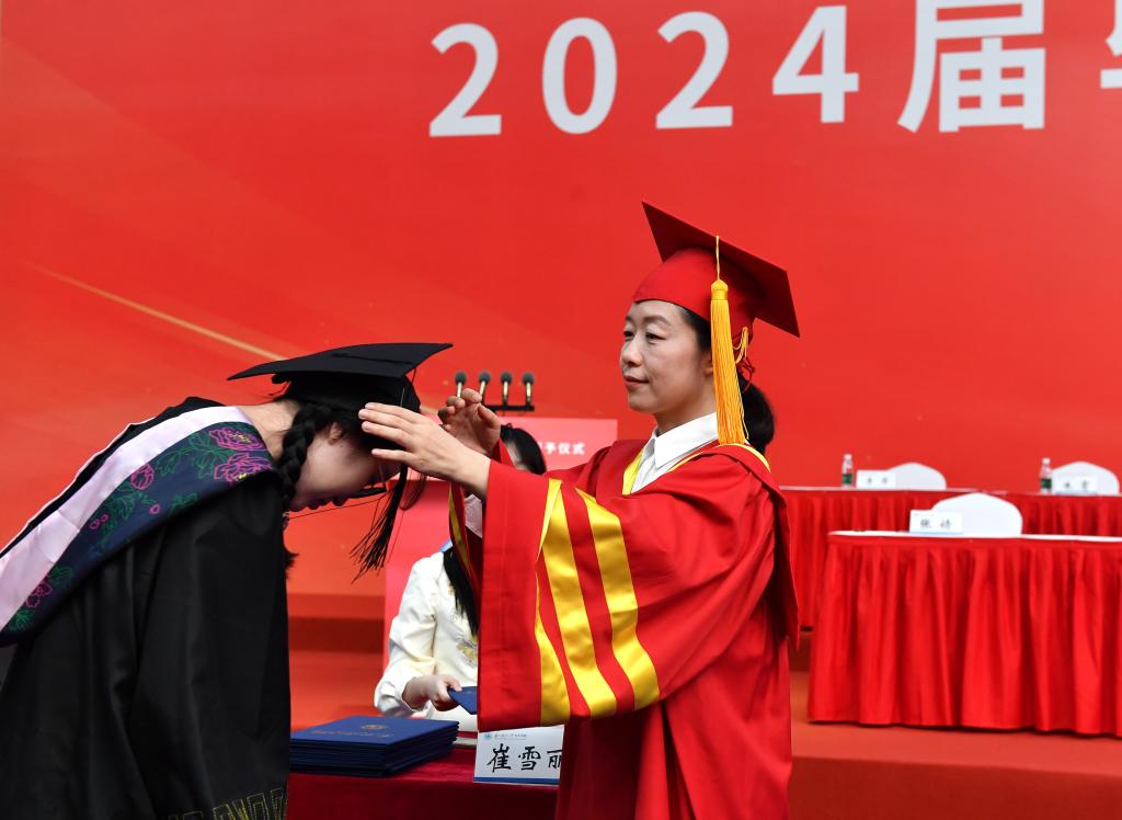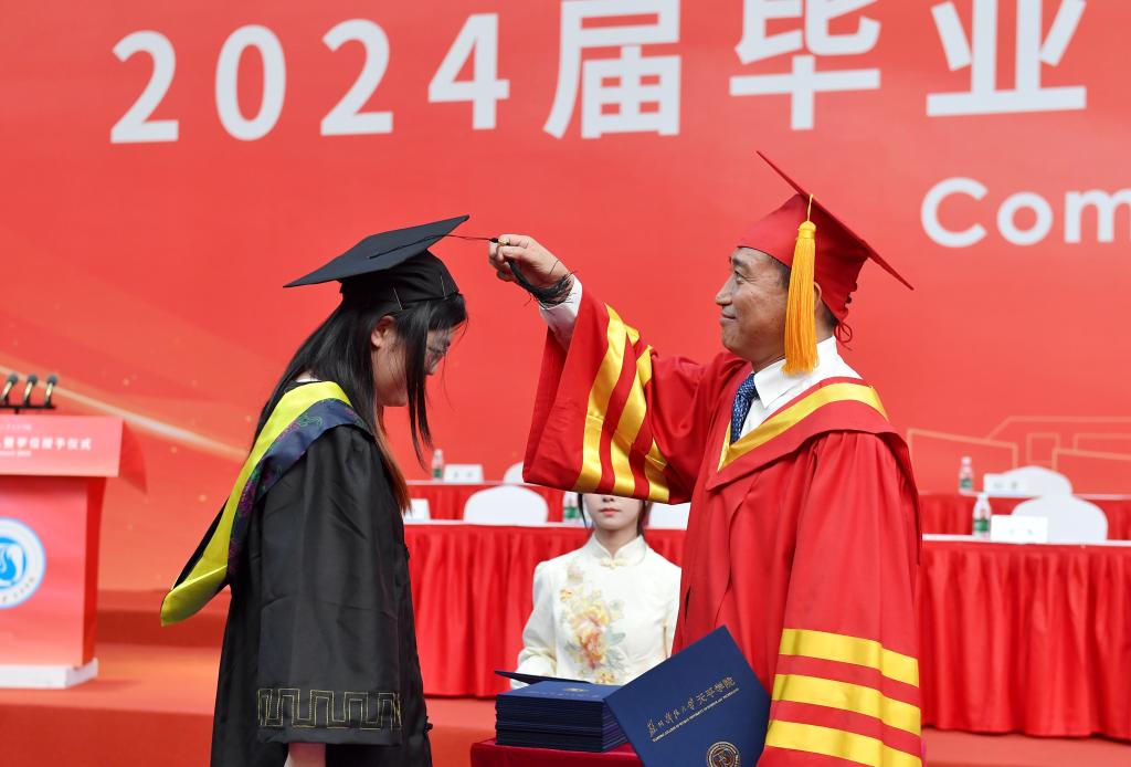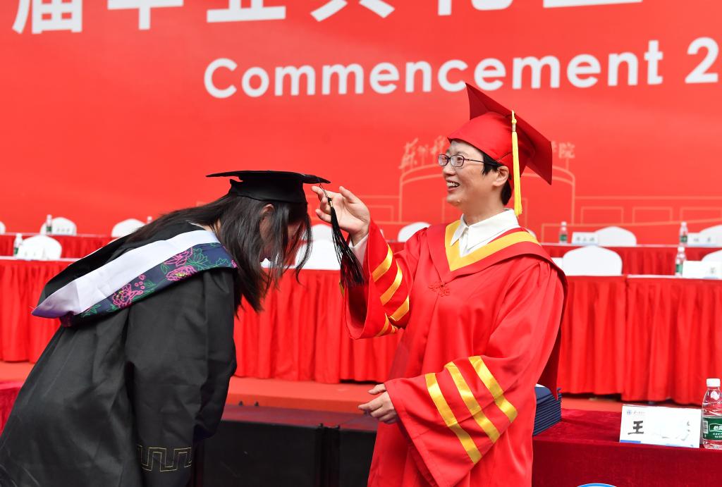 与会领导为现场的学士学位获得者一一拨流苏授学位,送上真诚的祝福并合影留念。