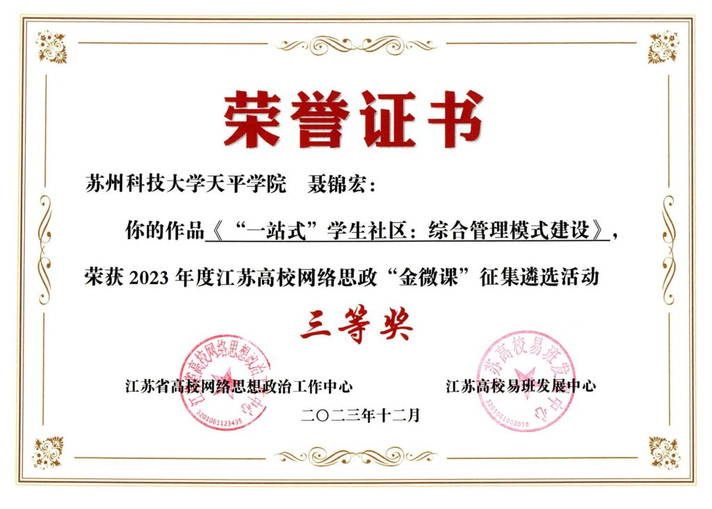 近日,江苏省高校网络思想政治工作中心公布了2023年度江苏省高校网络思政“金微课”征集评选活动结果,我院学生处聂锦宏老师微课作品《“一站式”学生社区:综合管理模式建设》荣获三等奖。来自东南大学、苏州大学等74所高校教师作品参加评选,活动评选出本科组一等奖4项、二等奖8项、三等奖12项,bat365官网为全省获奖高校中的唯一一所民办本科高校。