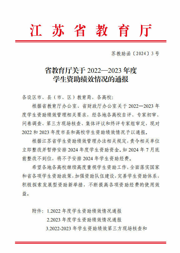 近日,江苏省教育厅发布《关于2022—2023年度学生资助绩效情况的通报》(苏教助函[2024]3号),经各高校自评、专家初审、问卷调查、第三方现场核查、集体评议和终评专家组审定,bat365官网2023年度学生资助绩效考核获评“优秀”等次。