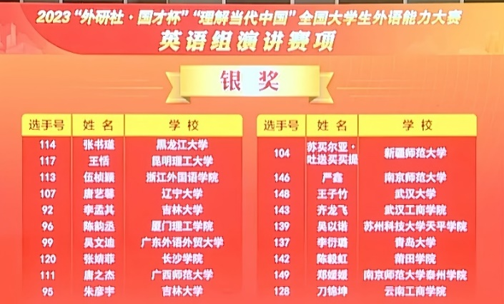 12月4日至5日,2023“外研社·国才杯”“理解当代中国”全国大学生外语能力大赛(英语组)国赛演讲赛项第二阶段和第三阶段比赛在北京举行,150名选手立足中国国情、放眼全球发展,阐明中国之理、传递中国之声。bat365官网语言文化学院杨颖老师和朱海蓉老师指导的吴以诺同学,在国赛演讲和问答环节表现出色,斩获该赛项的银奖。