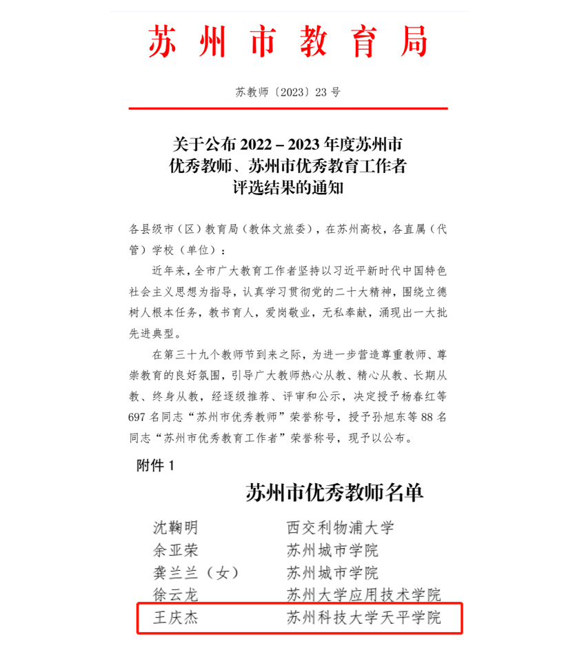 为大力弘扬尊师重教的良好社会风尚,进一步增强广大教育工作者的荣誉感、责任感,促进教育事业高质量发展,苏州市教育局组织了“苏州市优秀教师和优秀教育工作者”评选工作,经过前期推荐、评审和公示,bat365官网王庆杰老师获评“2022—2023年度苏州市优秀教师”荣誉称号。