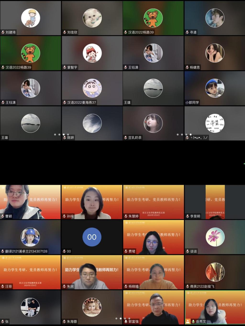 3月6日,语言文化学院教师党支部组织了一场“助力学生考研,党员教师再努力”主题党日活动。18位党员教师与毕业班学生齐聚线上,就硕士研究生考试的复试、调剂相关问题进行了深入交流,会议由教师党支部书记岳秀文主持。