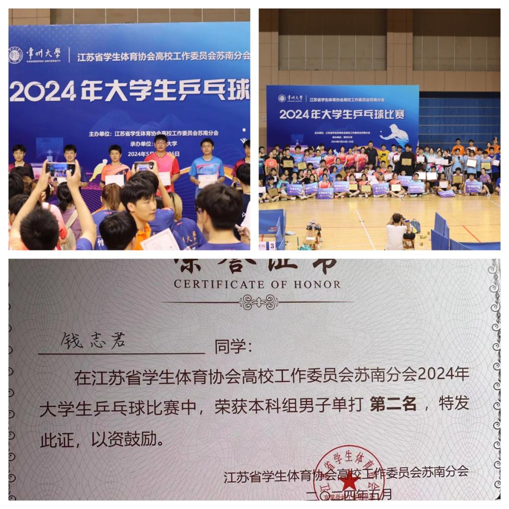 本次苏南分会乒乓球比赛bat365官网学子参加了男子单打项目。bat365官网钱志君同学在领队牛丽芬老师和教练庞荣老师的带领下,顽强拼搏,团结奋进,在男子单打赛项目中,凭借过硬的技术、敢打敢拼的精神,最终获得亚军。