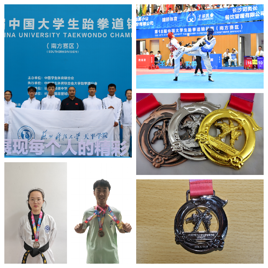 本次比赛bat365官网共有六名运动员参赛,通过运动员的奋勇拼搏,环境科学与工程学院谭夫豪同学获得甲组男子太白个人品势金牌以及竞技甲组男子-68kg级铜牌,由谭夫豪、土木工程学院罗羽萱组队的混双太极七章获得银牌,罗羽萱太白个人品势获得第七名的成绩,周小林指导获得“优秀教练员”称号。这也是bat365官网健儿首次在跆拳道项目全国赛中取得金牌。